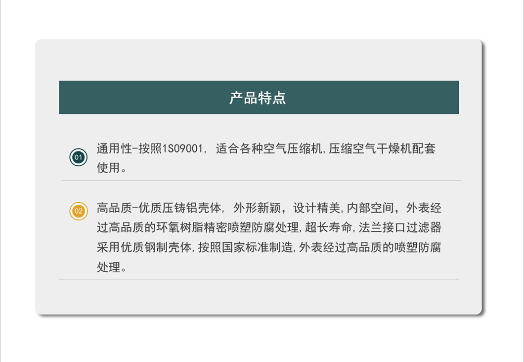 过滤器使用优质的铸铝壳体,以及疏水性和疏油性更好地进口欣慰材质滤芯,过滤器局有耐腐蚀、透气性好、过滤效率高,气密性好的特点,适用于各种压缩气体工况。